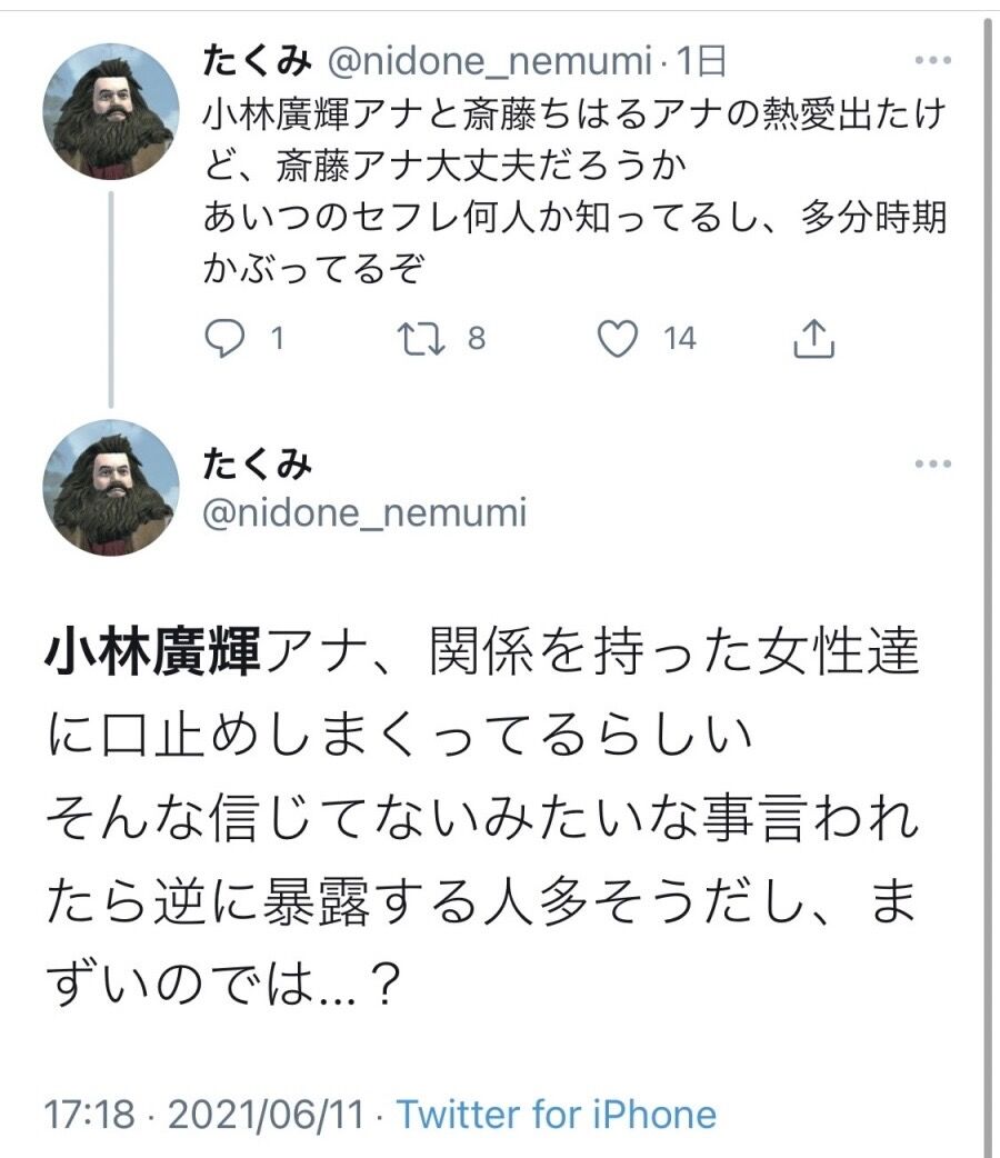 小林アナを巡っては、11日発売のフライデーがテレビ朝日の斎藤ちはるアナ(24)との交際を報道。同誌は小林アナが斎藤アナと過ごした翌日に、航空会社勤務の女性と自宅マンションに数時間滞在しているところもキャッチ。二股疑惑が浮上していた。