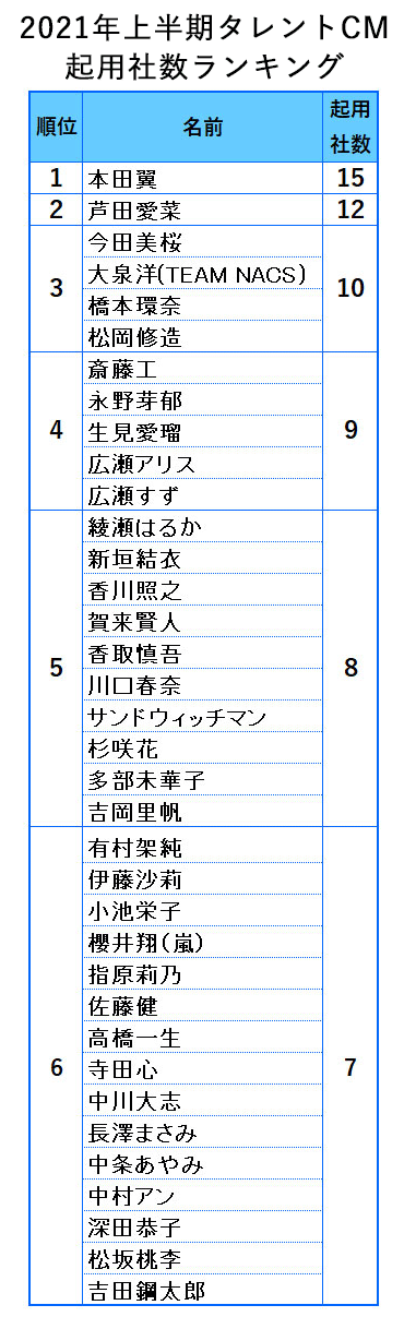 ニホンモニター2021年上半期タレントCM起用社数ランキング 2021-07-01