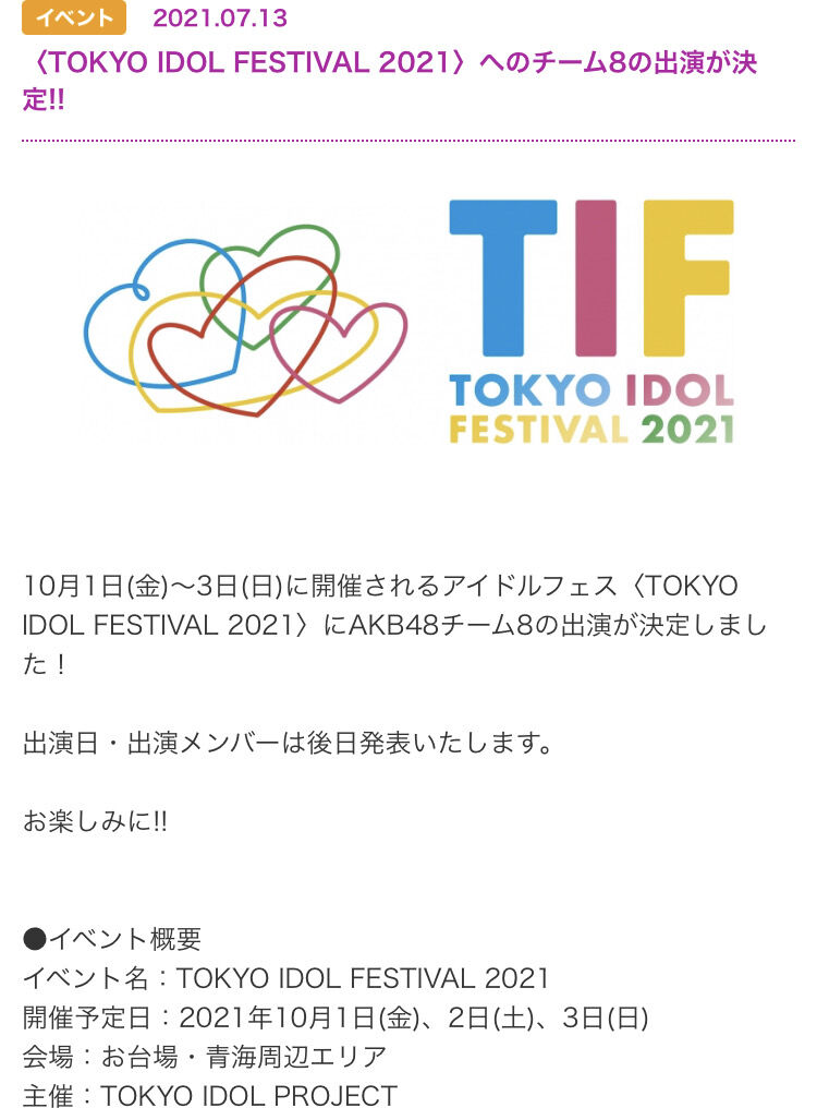 【速報】TIF2021出演者第1弾発表!チーム8が出演決定キタ━━━━(゚∀゚)━━━━!!