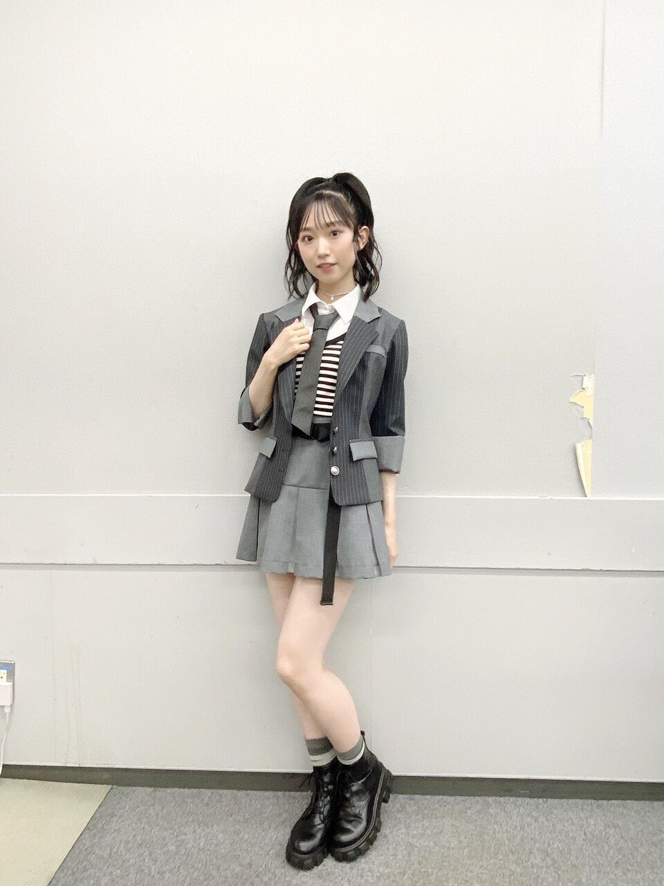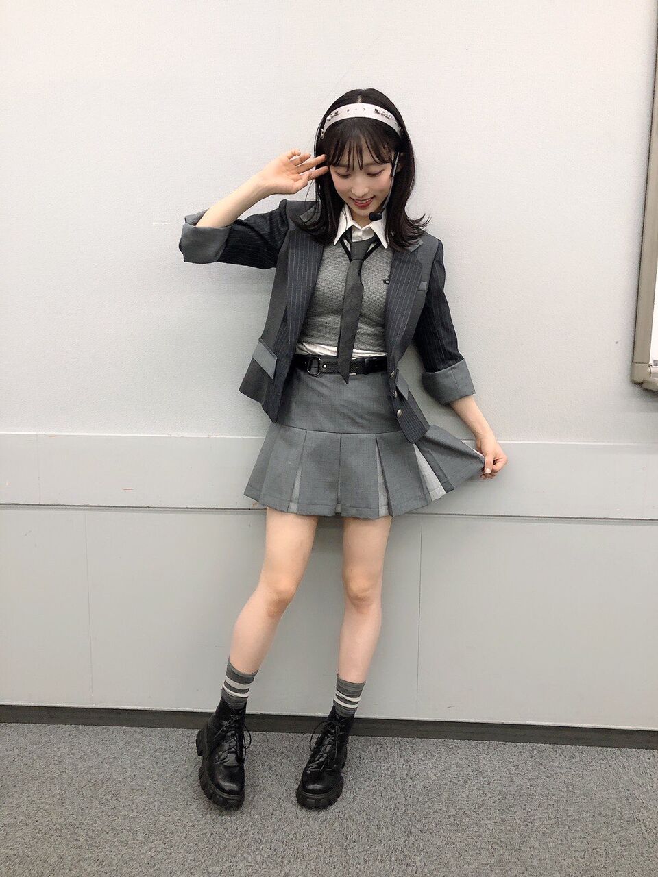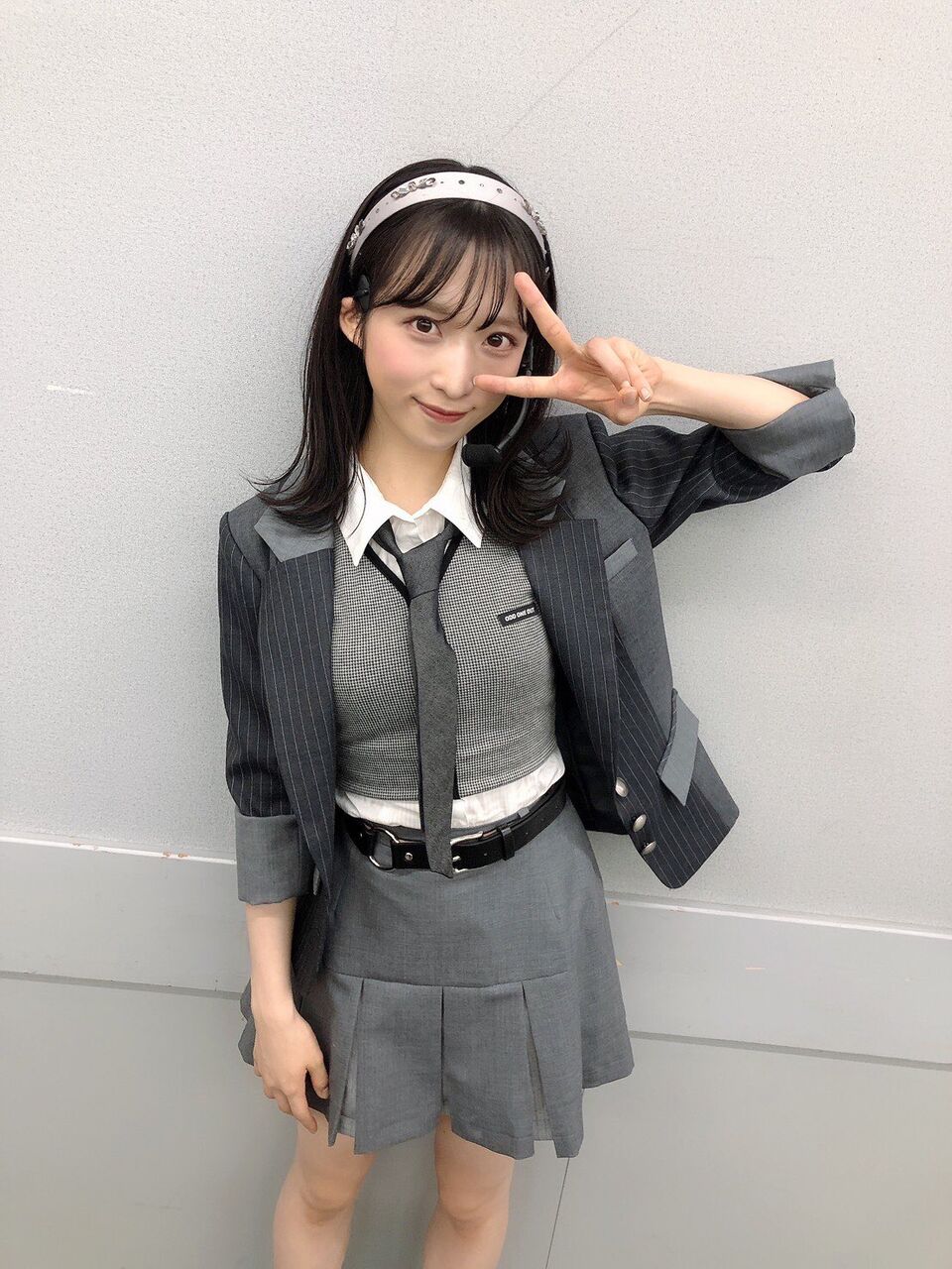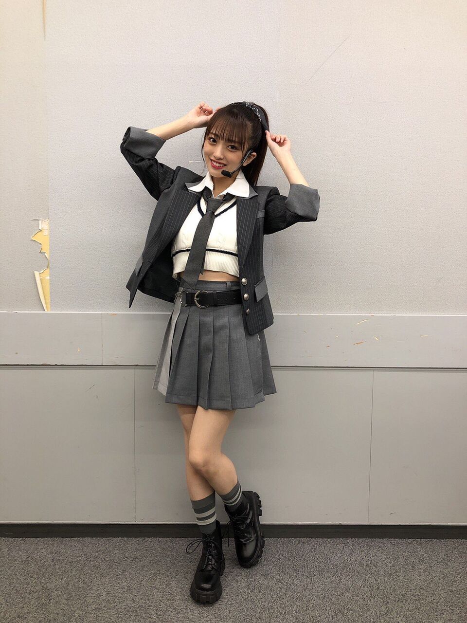 怜ちゃん(西川怜)も現役高校生なのですが、彼女が持つ知的なイメージを生かす為に、少し進学校っぽいんだけど青春感が強めなスタイリングにしました(ニュアンスで伝わらない可能性)でもよく見るとダンスに映えるチェーン付きベルトを着けてるのがポイントです