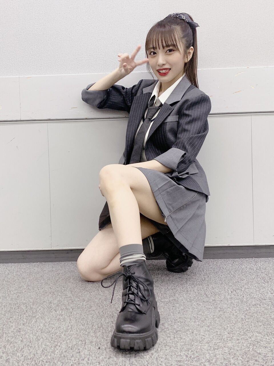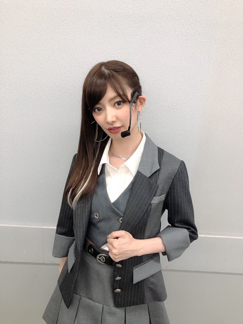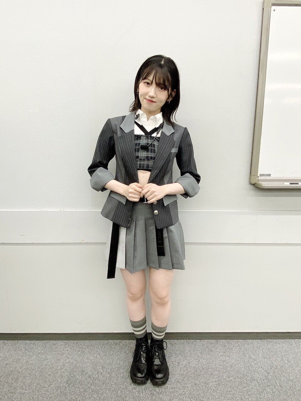 怜ちゃん(西川怜)も現役高校生なのですが、彼女が持つ知的なイメージを生かす為に、少し進学校っぽいんだけど青春感が強めなスタイリングにしました(ニュアンスで伝わらない可能性)でもよく見るとダンスに映えるチェーン付きベルトを着けてるのがポイントです