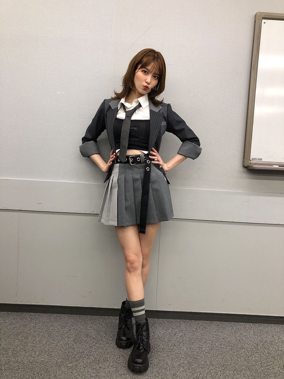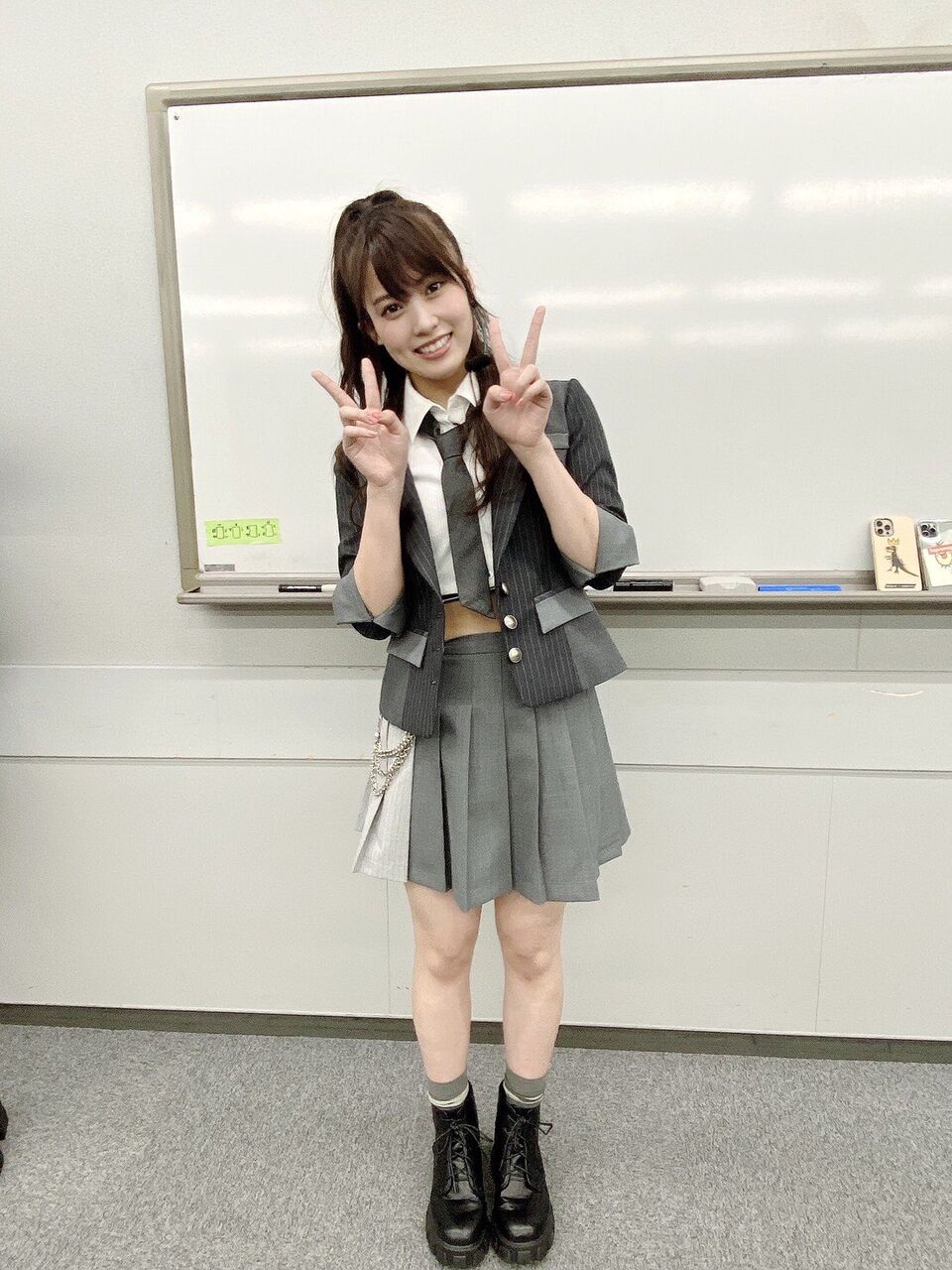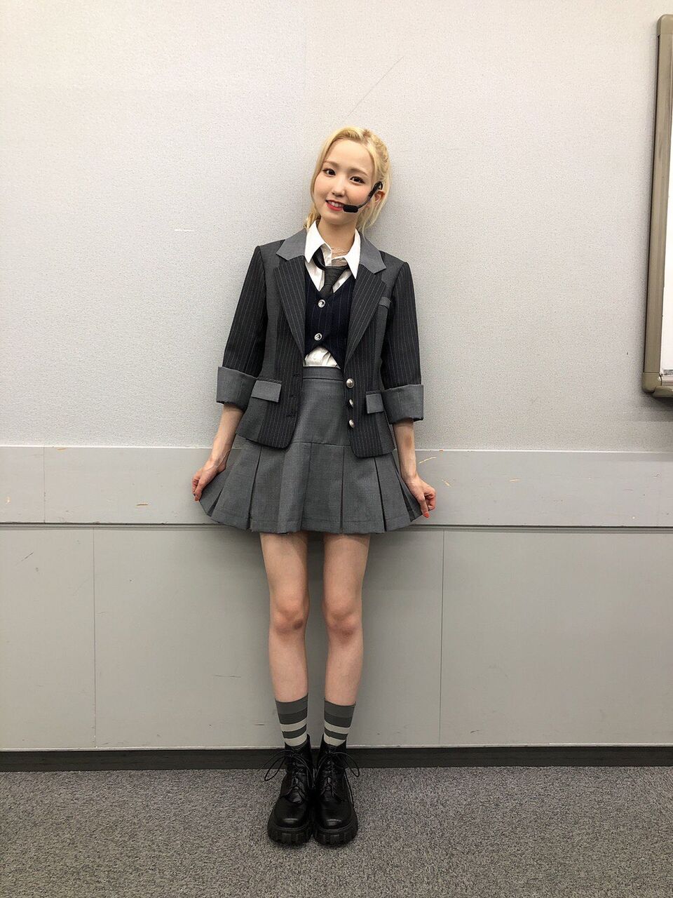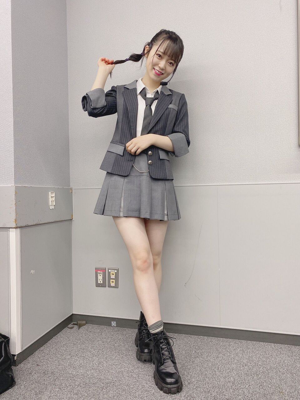 怜ちゃん(西川怜)も現役高校生なのですが、彼女が持つ知的なイメージを生かす為に、少し進学校っぽいんだけど青春感が強めなスタイリングにしました(ニュアンスで伝わらない可能性)でもよく見るとダンスに映えるチェーン付きベルトを着けてるのがポイントです