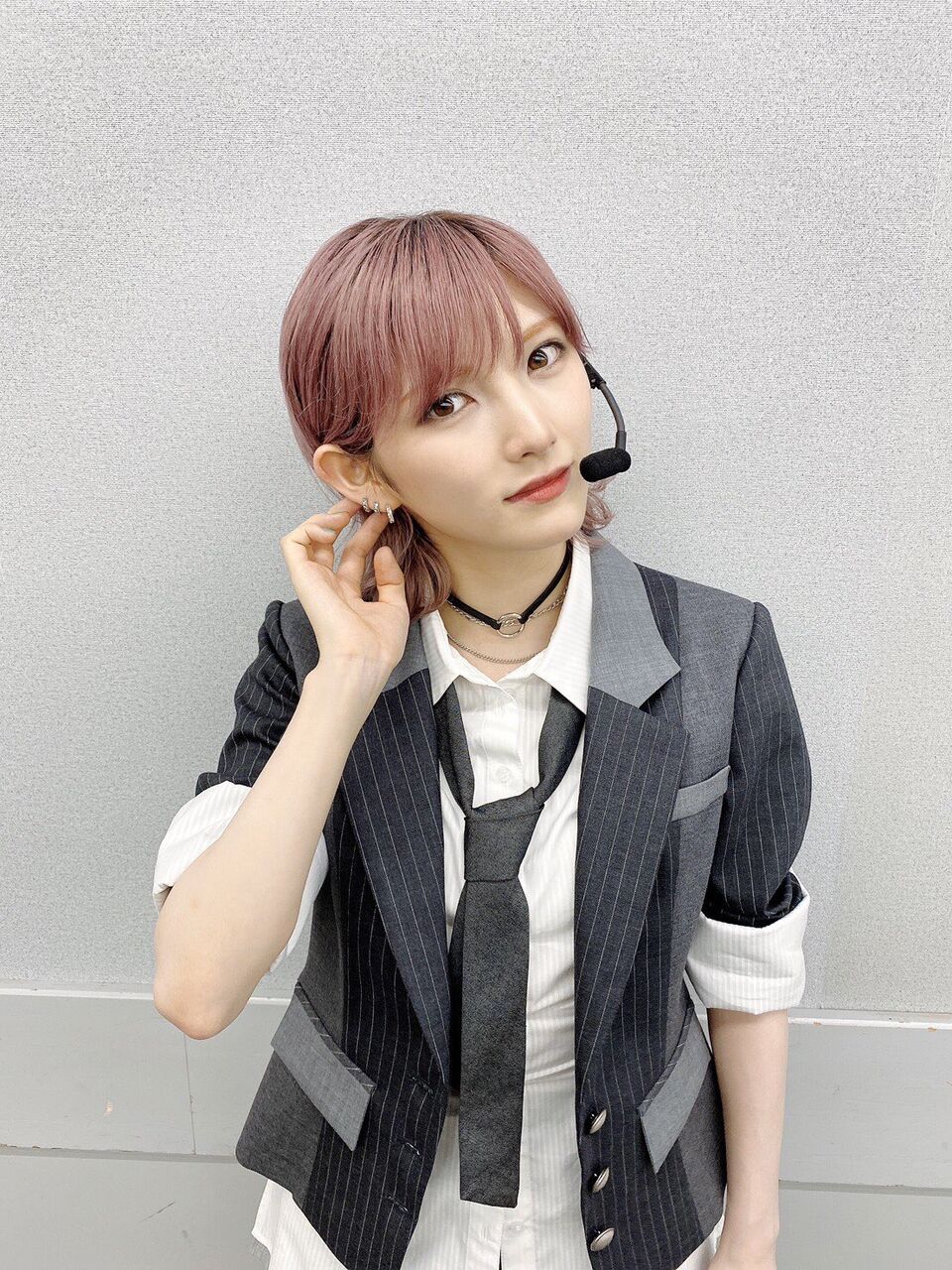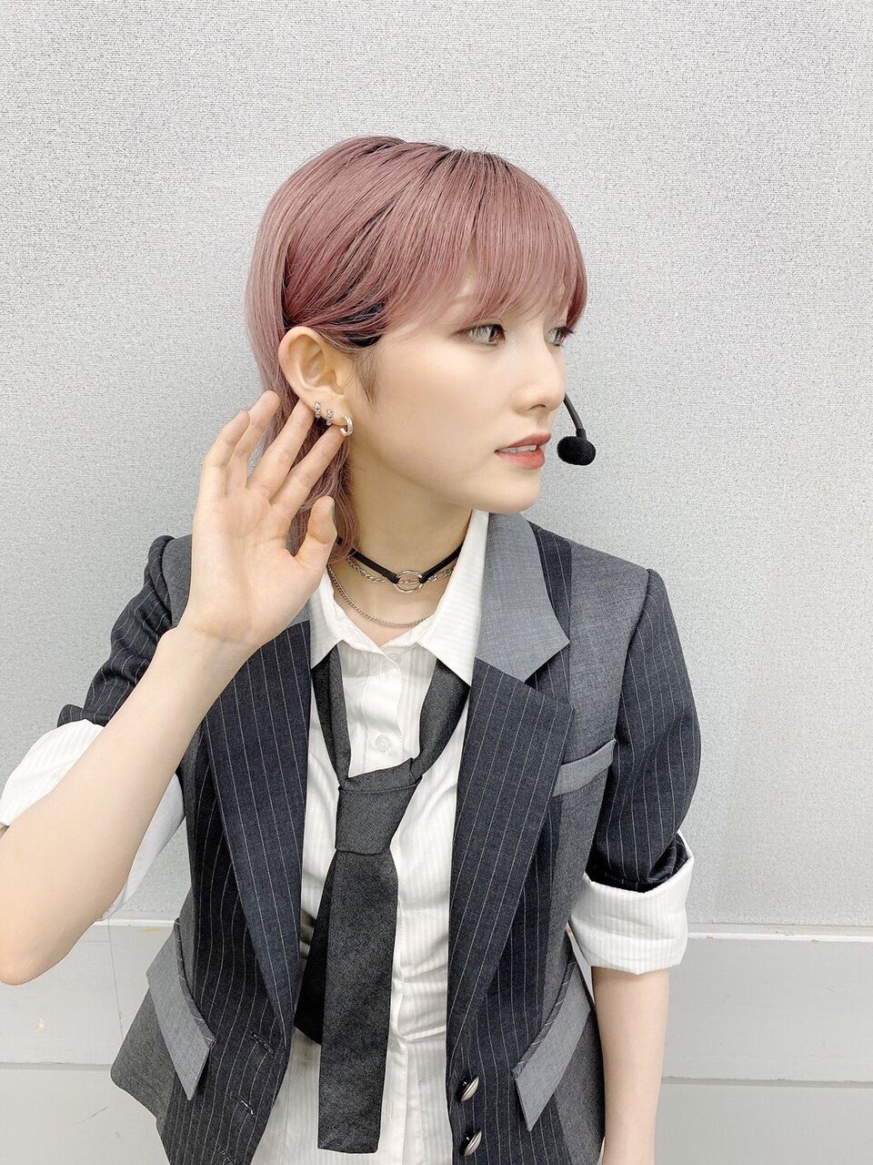 なぁちゃんは一人だけシャツが長く外出しでシンプルだけど、ゴリゴリに耳にピアスとイヤカフとチョーカーが付いているスタイルです