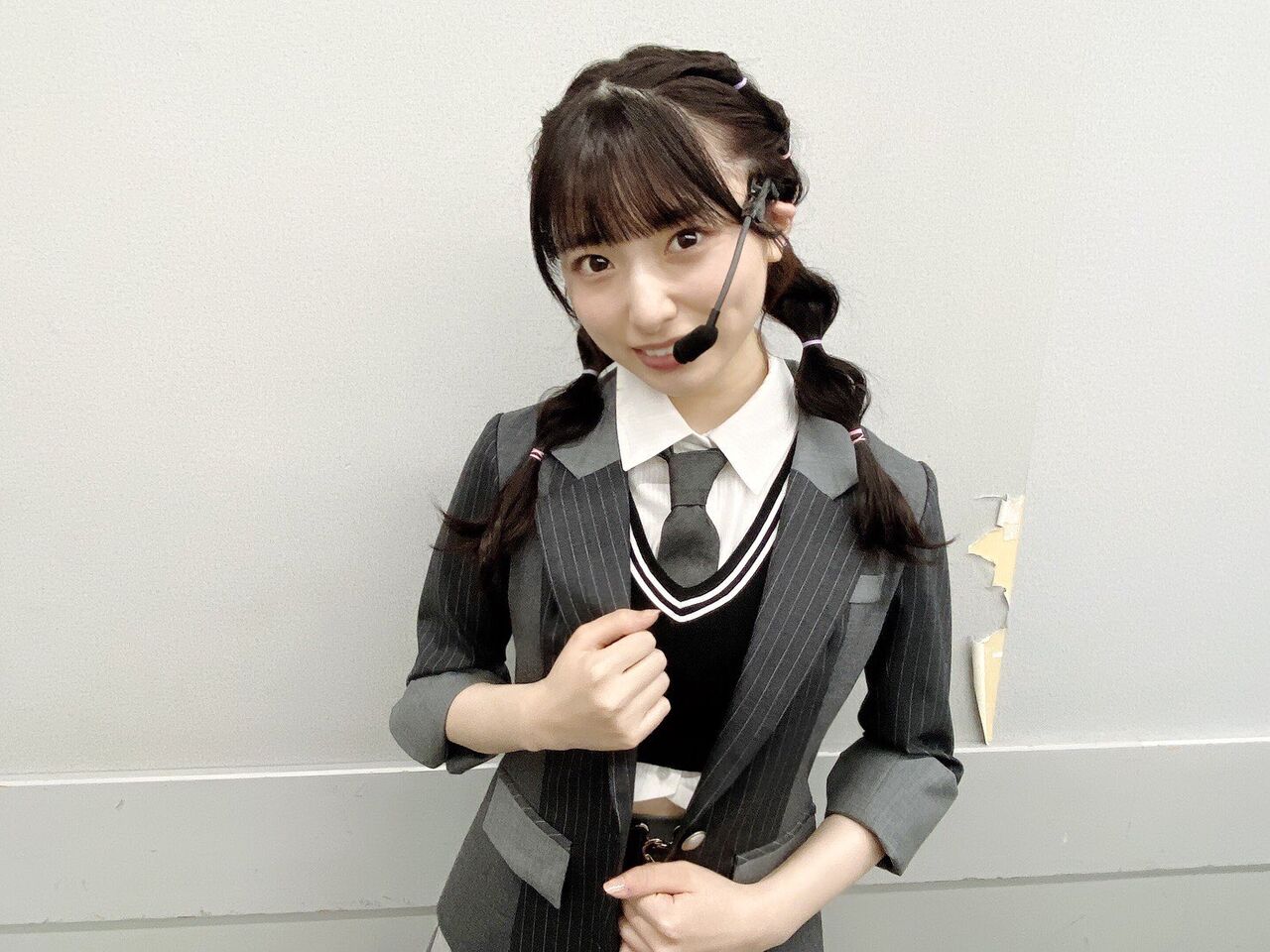 さとね(久保怜音)は現役高校生の一人なので、スクールガール風な紺の2本ライン入りのベストからシャツが出ている形で、ネクタイも他の子と比べてきちんと結んでいるスタイリングにしました