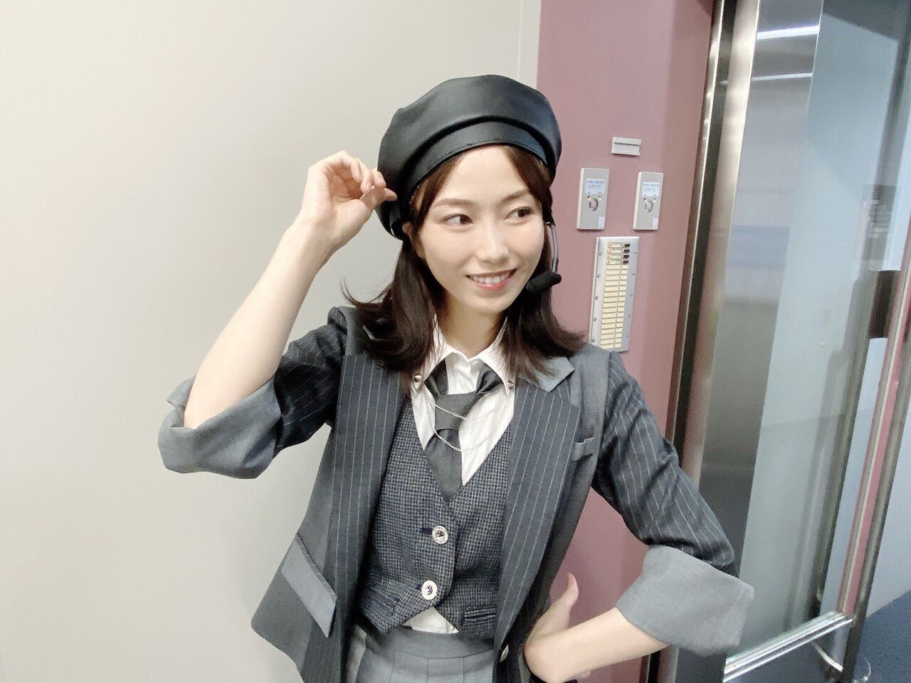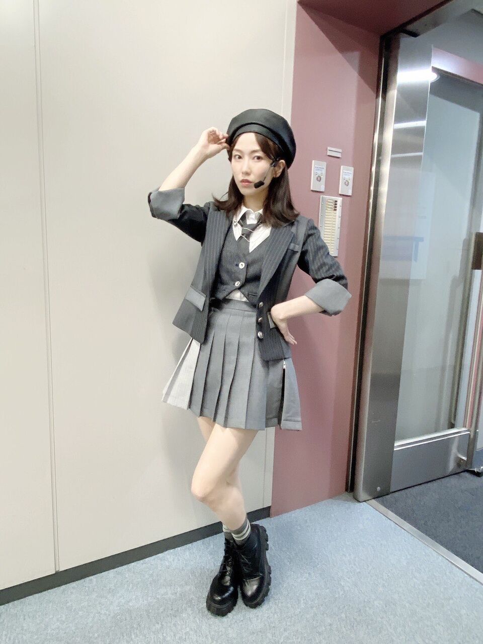由依ちゃん(横山由依)はクラシカルな雰囲気が似合うので、ブリティッシュ風にしたくて、ガンクラブチェックのベストに細めチェーンにベレー帽というスタイリングにしました