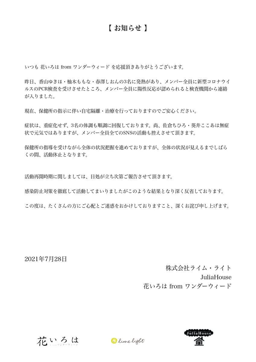 大盛真歩・倉野尾成美・永野芹佳・鈴木優香につきましては、7月30日(金)に発熱の症状があり、昨日7月31日(土)に首都圏の医療機関でPCR検査を受け、23時頃 感染が確認されました。