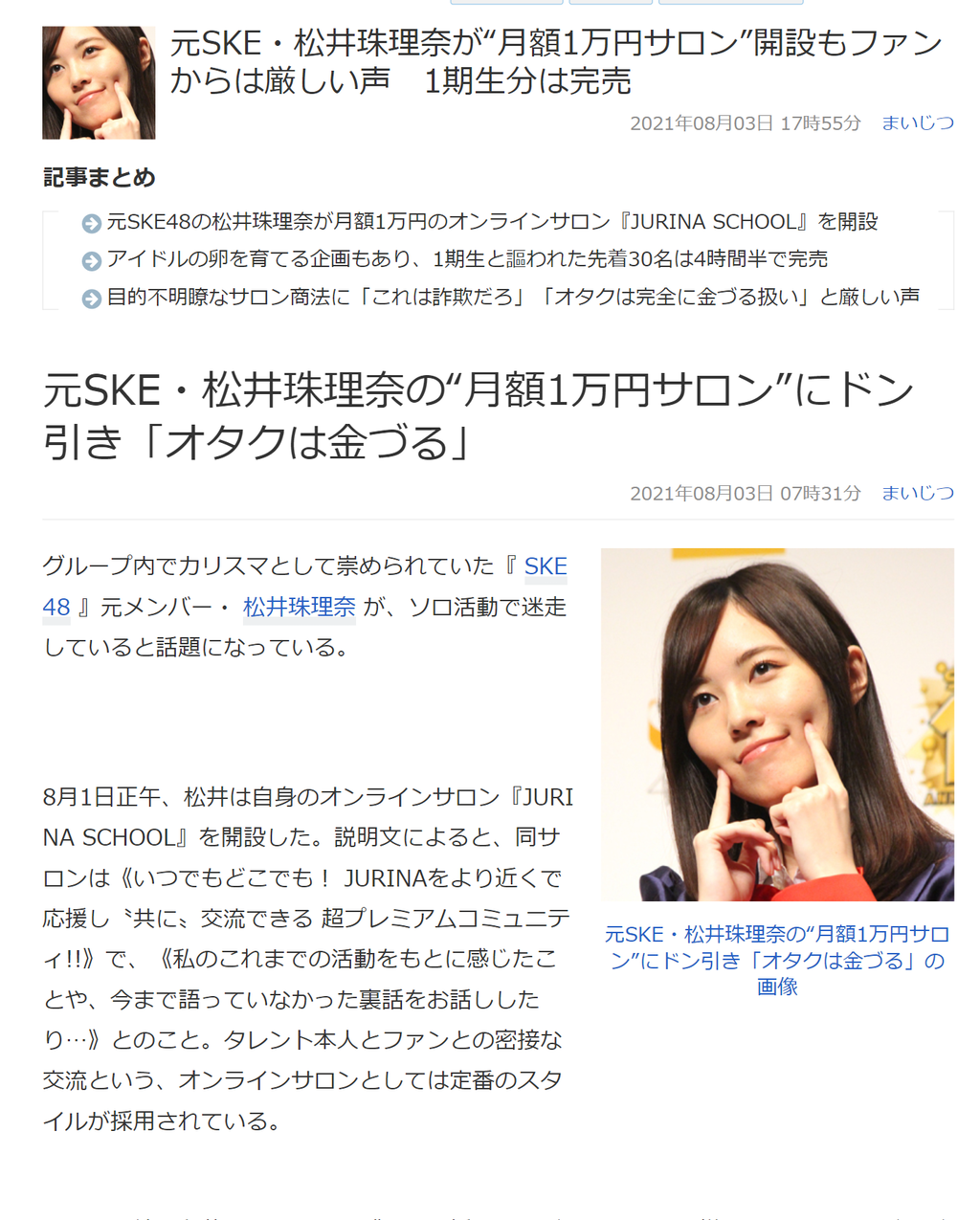 8月1日正午、松井は自身のオンラインサロン『JURINA SCHOOL』を開設した。説明文によると、