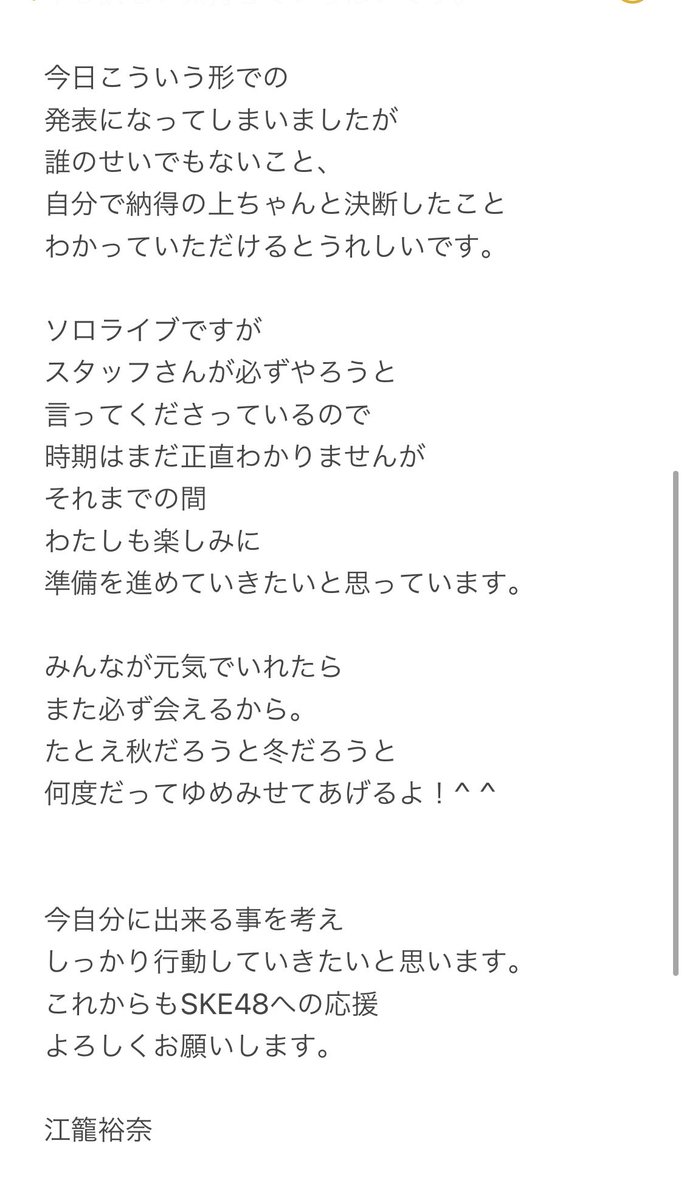 【悲報】SKE48 江籠裕奈 コロナ感染者との濃厚接触者と認定され ソロLIVEが延期……