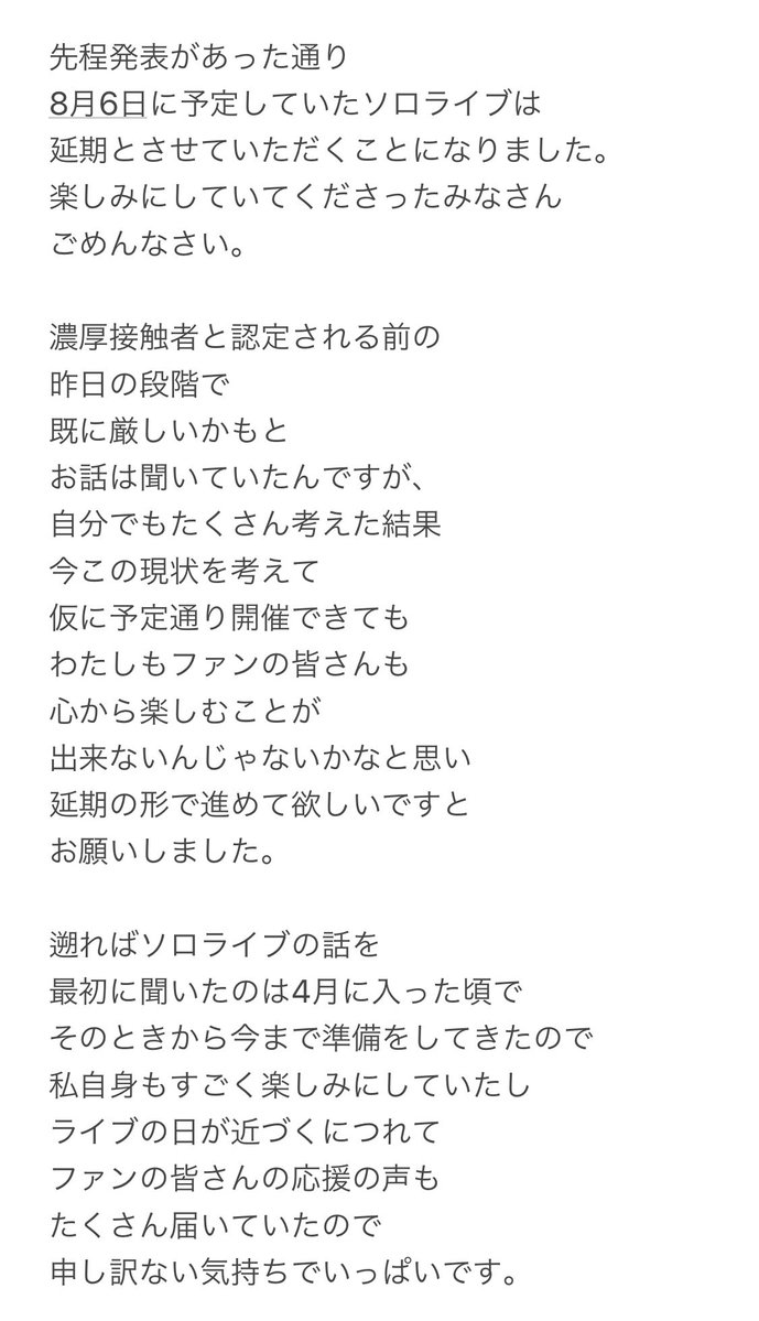ライブを楽しみにお待ちいただいておりました多くのファンの皆様にはご迷惑をお掛けいたしますが、何卒ご理解賜りますようお願い申し上げます。