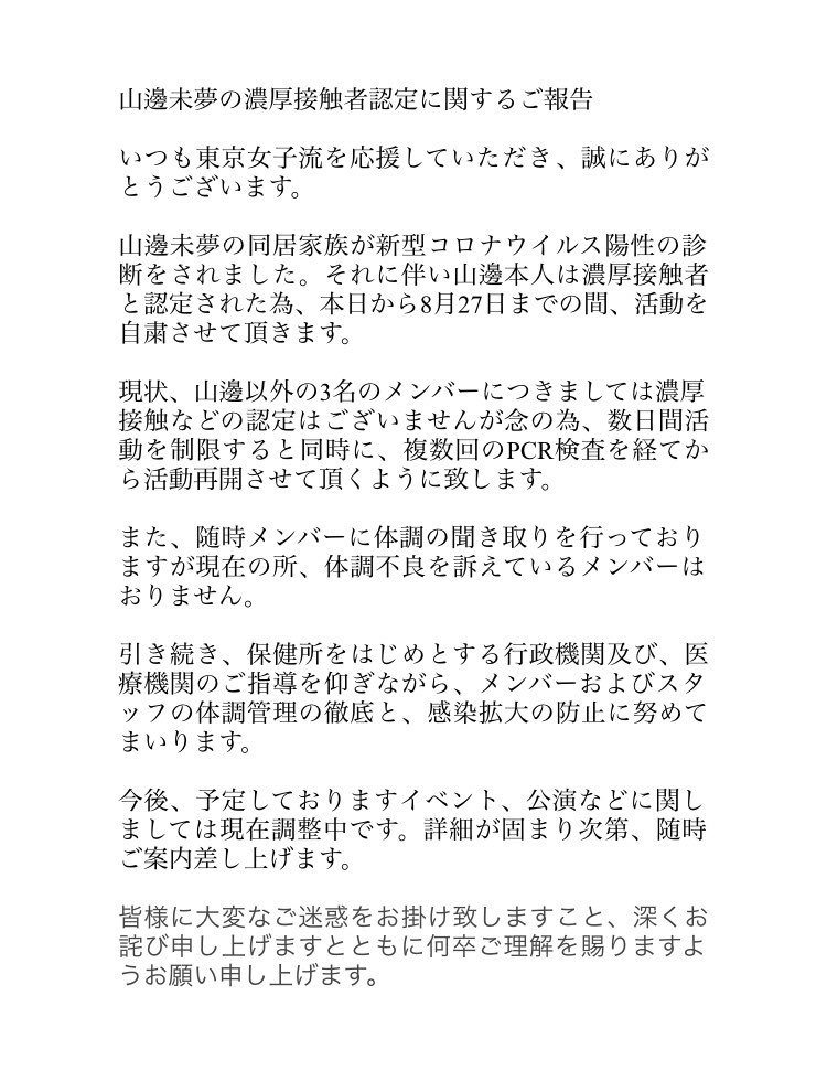 山邊未夢の同居家族が新型コロナウイルス陽性の診断をされました。それに伴い山邊本人は濃厚接触者と認定された為、本日から8月27日までの間、活動を自粛させて頂きます。