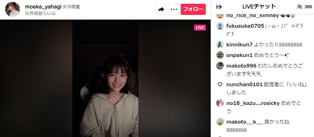【悲報】俺たちの矢作萌夏ちゃんのTiktokライブの視聴者数がたったの380人・・・