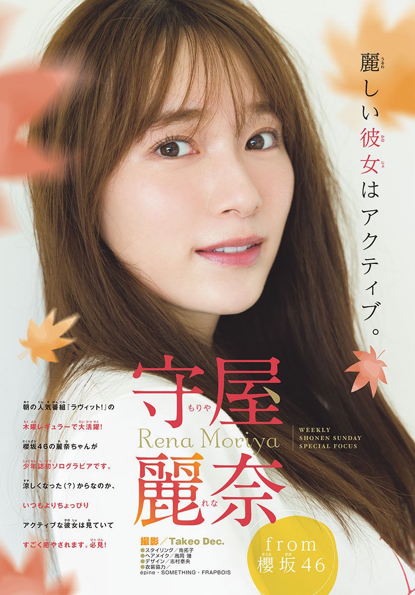 アイドルグループ「櫻坂46」の守屋麗奈さんが、9月22日発売のマンガ誌「週刊少年サンデー」(小学館)43号の表紙に登場した。