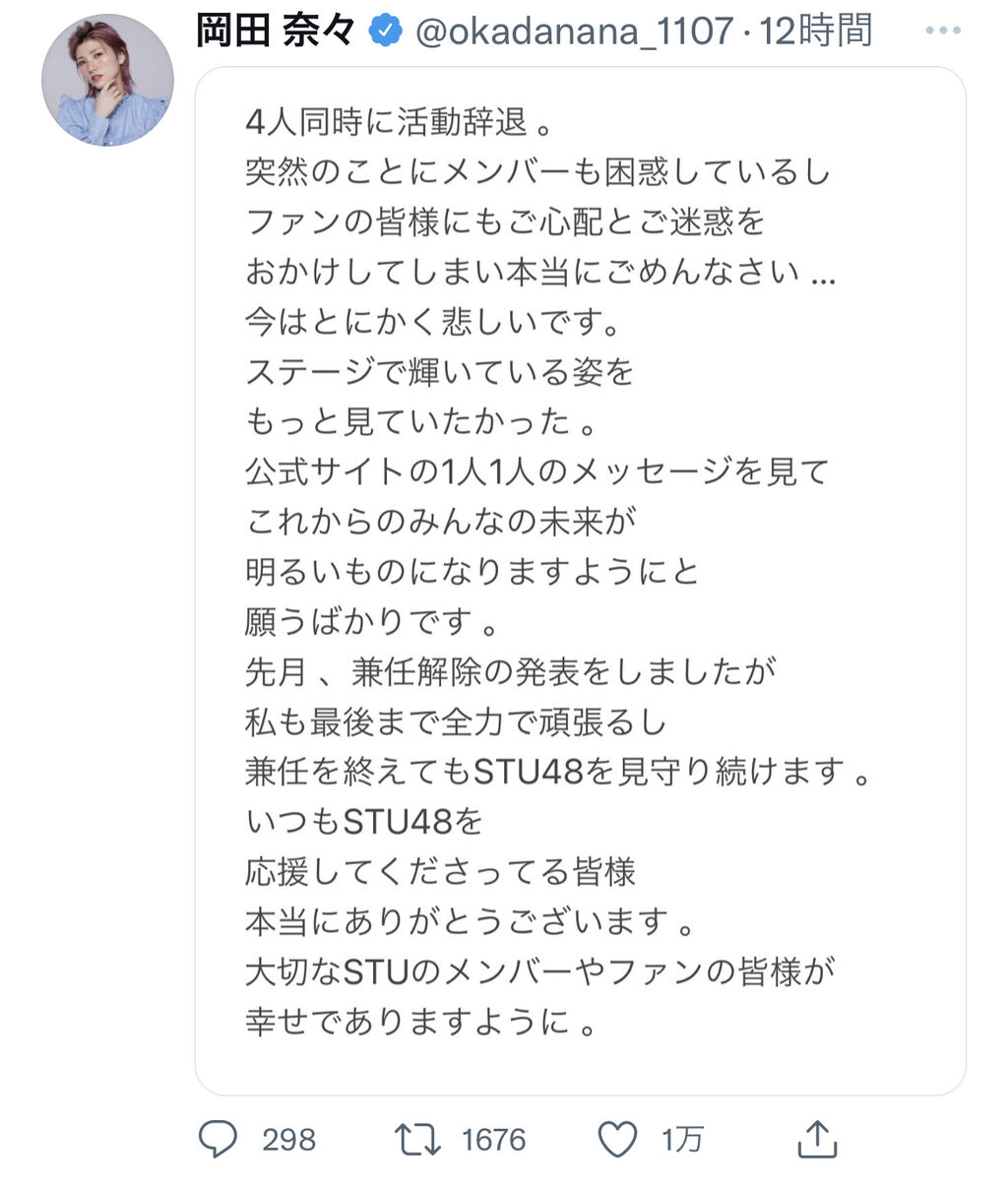 STU岡田奈々さん、お気持ち表明