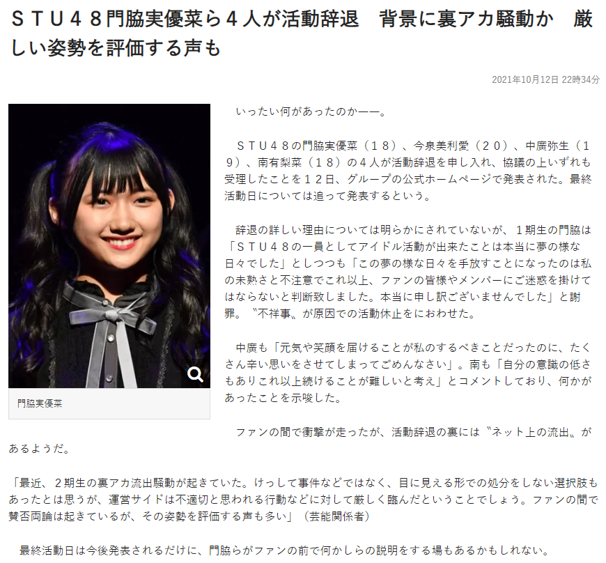 STU48の門脇実優菜(18)、今泉美利愛(20)、中廣弥生(19)、南有梨菜(18)の4人が活動辞退を申し入れ、