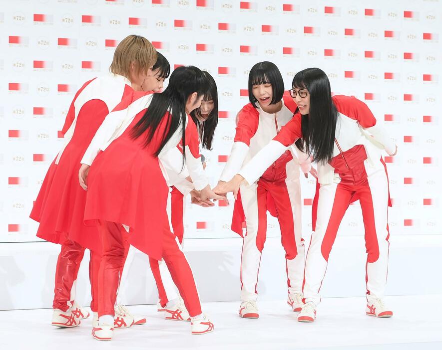 >BiSHは「私達BiSHが小さいライブハウスから届けてきて、私たちの夢でもあった紅白に出演決まってうれしく思ってます」と喜び。そして「ここで私たちの気合をみてほしいんですけど」と切り出すと突然円陣を組み「せーの、ち○ぽー」と発声。 驚いた司会者は「今のかけ声というのは?」と聞くと「初めてのライブからやってる円陣で、ライブの前に必ず『ち○ぽー』って言わしてもらってます。すみません」と説明した。 これに一坊寺剛チーフプロデューサーは「めっちゃ面白かったですね。(本番は)楽しみ。それに尽きる」と語ると「今日は生放送じゃなくて良かった。これNGですよね。そんなことしたら僕がヤバイです。節度あるように、ご理解していただいて」と円陣かけ声に苦笑していた。