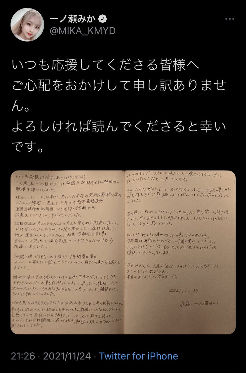 一ノ瀬は自身のツイッターに直筆の長文をアップし、脱退を報告。