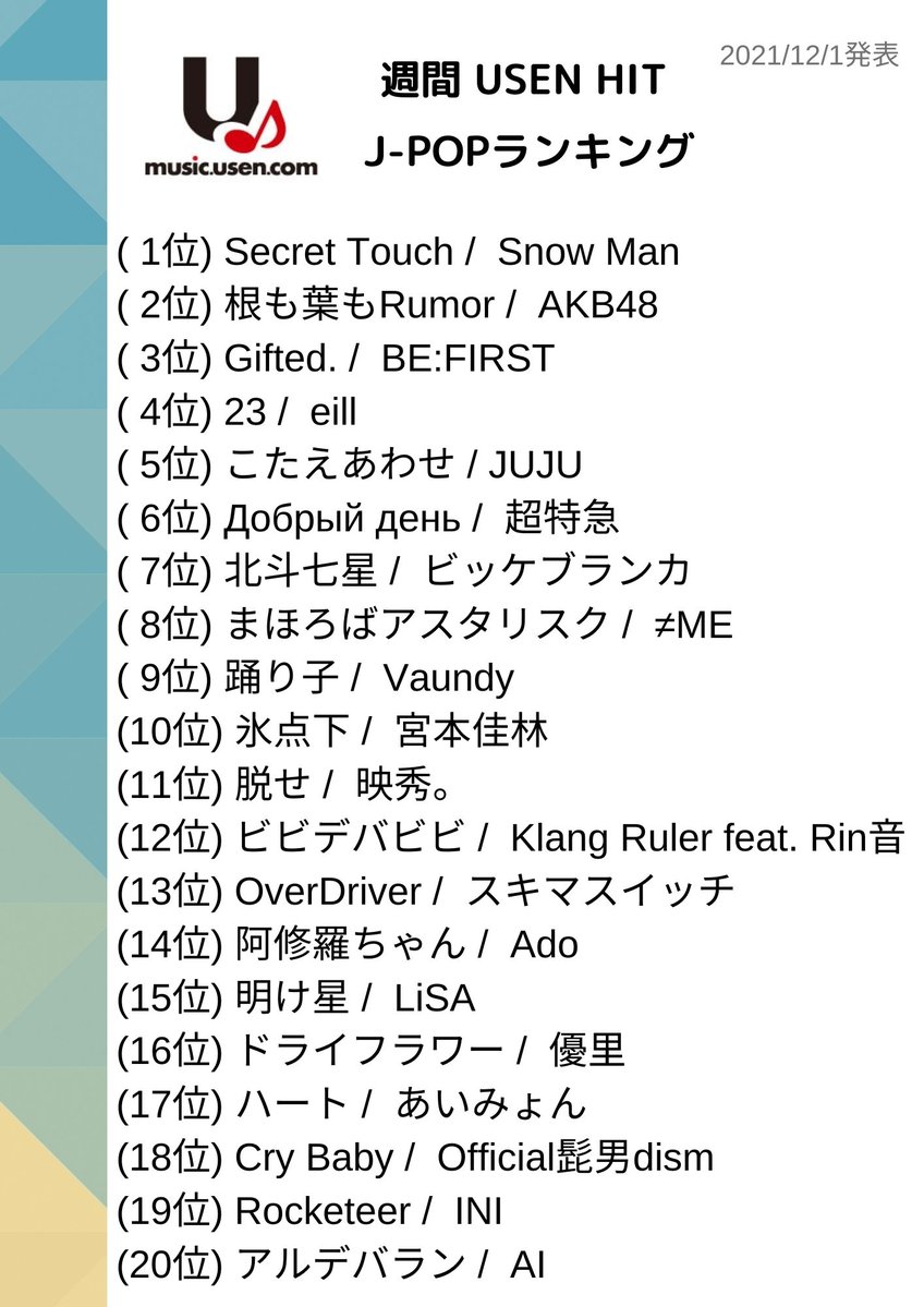 #SnowMan #AKB48 #BEFIRST #eill #JUJU #超特急 #ビッケブランカ #ノイミー #Vaundy #宮本佳林 #映秀 #KlangRuler #Rin音 #スキマスイッチ #Ado #LiSA #優里 #あいみょん #Official髭男dism #INI #AI