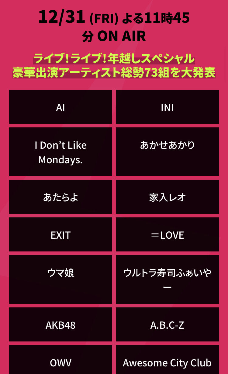 まぁイコノイはTBSで冠番組やってたからコネあるわな、あと姉妹グループだとHKTに関しては大晦日にハウステンボスでのカウントダウンライブに出るから、これに出ないのはかなり前からわかってたよ。