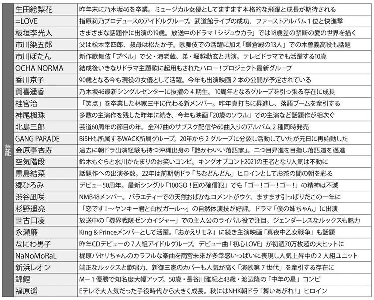 2022年、明日への不安が渦巻く空気を払しょくし、新時代の主役に躍り出るのは誰か。本誌は独断と偏見で、今年“絶対来る”100人を選んだ。