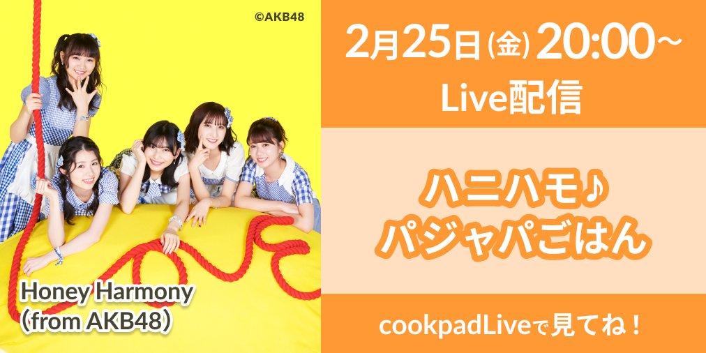 2/25(金) 20:00より、「cookpadLiveアプリ」で配信されるクッキングLive番組  Honey Harmonyの『ハニハモ♪パジャパごはん』配信決定!!