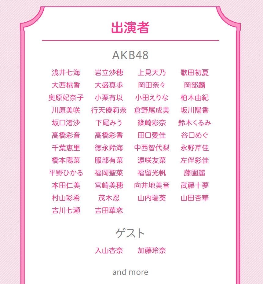 浅井七海、岩立沙穂、大盛真歩、岡田奈々、柏木由紀、篠崎彩奈、鈴木くるみ、田口愛佳、谷口めぐ