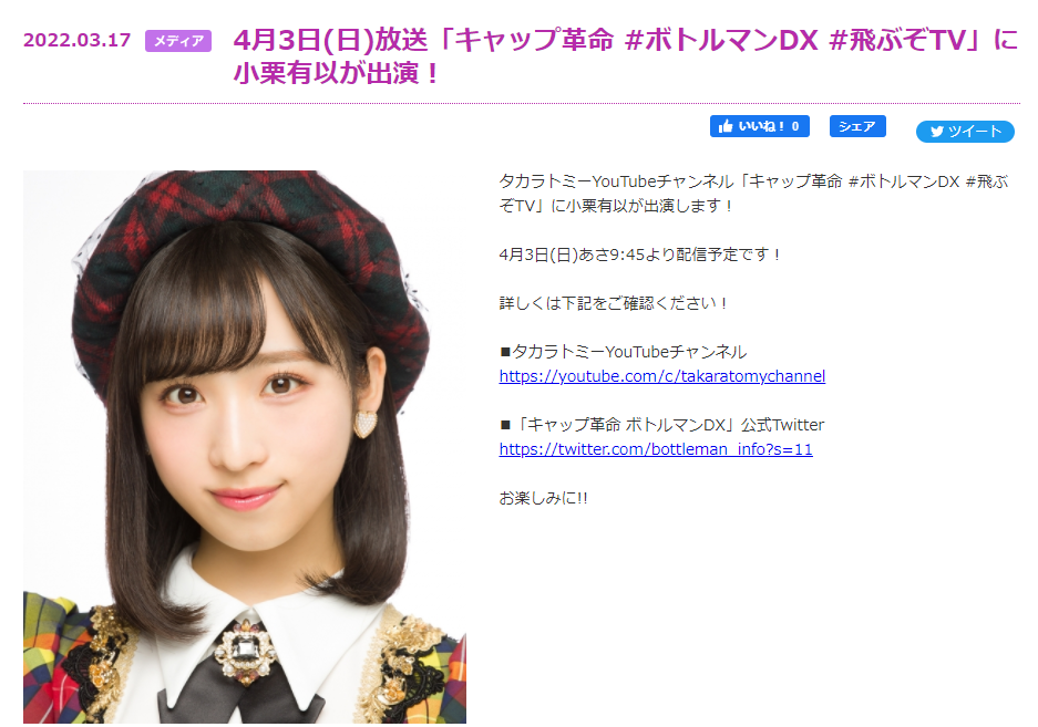 4月3日(日)放送「キャップ革命 #ボトルマンDX #飛ぶぞTV」に小栗有以が出演!