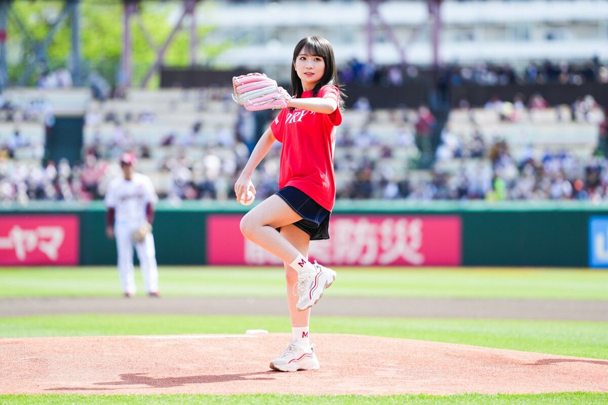 秋元さんは背番号「46」の入った赤いTシャツと、紺色のミニスカート姿でマウンドへ。