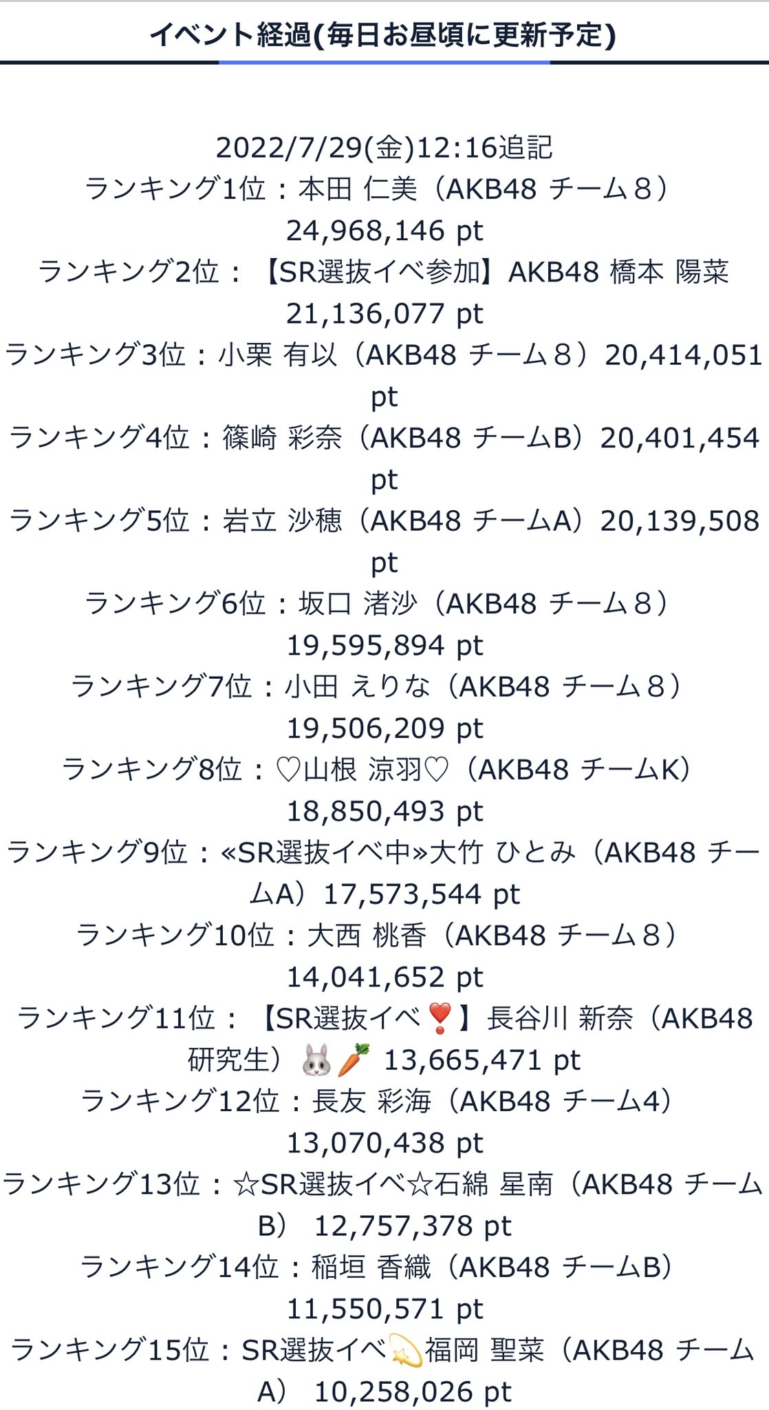 ランキング15位 : SR選抜イベ??福岡 聖菜(AKB48 チームA) 10,258,026 pt