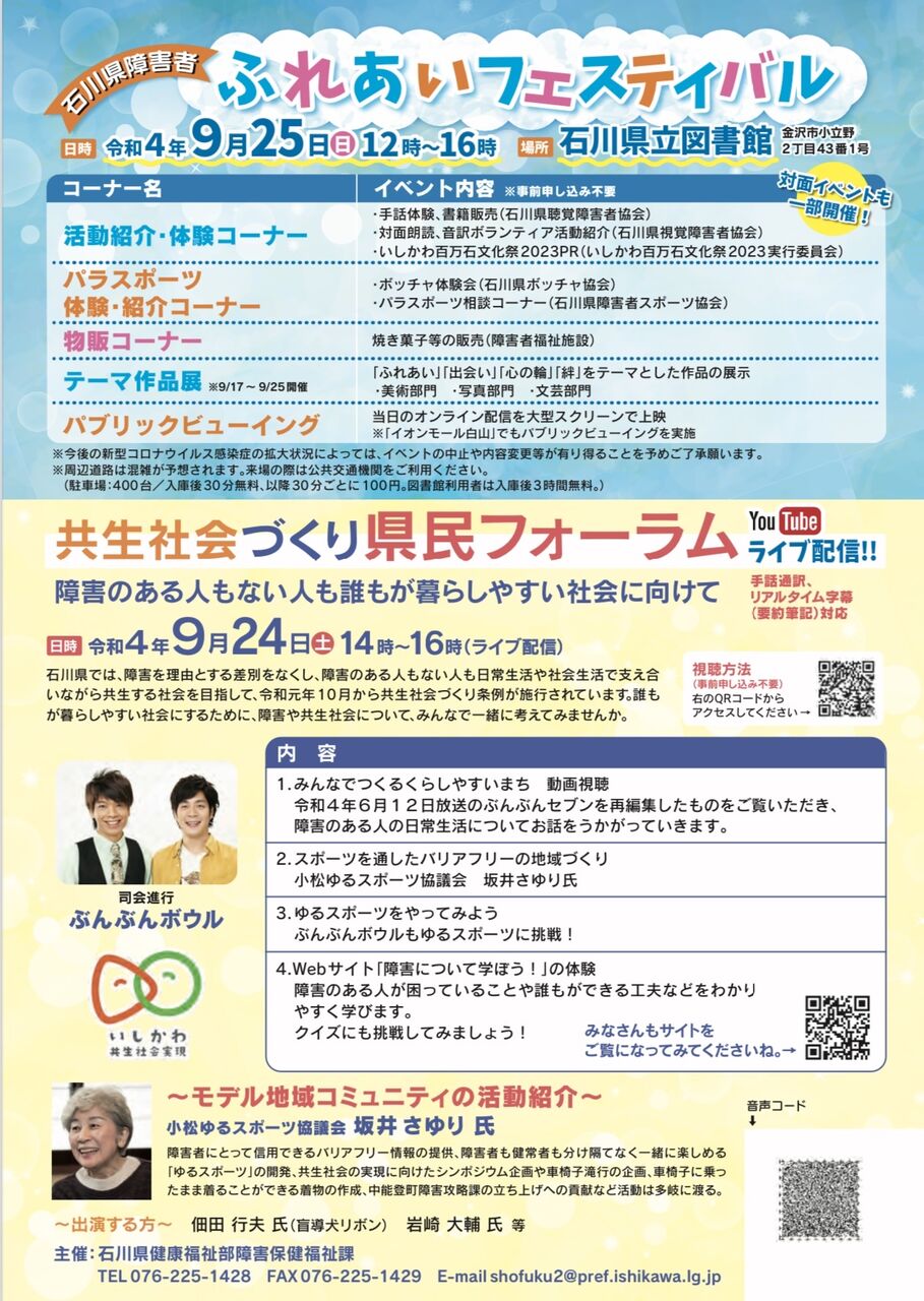 主な内容 活動紹介・体験コーナー(石川県視覚障害者協会、石川県聴覚障害者協会、いしかわ百万石文化祭2023実行委員会)