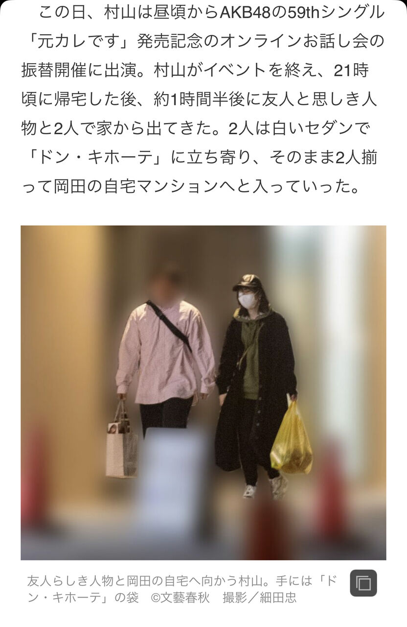この日、村山は昼頃からAKB48の59thシングル「元カレです」発売記念のオンラインお話し会の振替開催に出演。村山がイベントを終え、21時頃に帰宅した後、約1時間半後に友人と思しき人物と2人で家から出てきた。2人は白いセダンで「ドン・キホーテ」に立ち寄り、そのまま2人揃って岡田の自宅マンションへと入っていった。