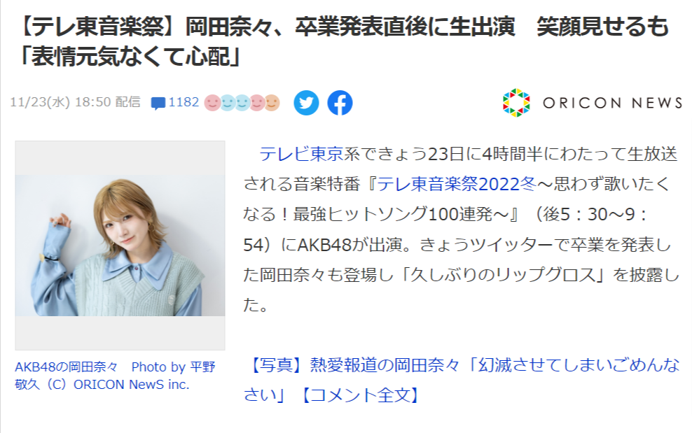 【悲報】岡田奈々が歌番組に出演するも「真面目なら辞退しろ、他のメンバーに迷惑」と大炎上