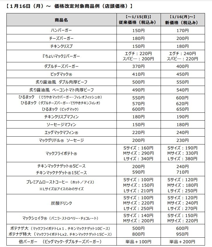 ※同じく1月16日(月)より、宅配サービス「マックデリバリー®」や、本格カフェコーヒーやスイーツを提供する“McCafé by Barista®”につきましても、価格を改定いたします。なお、改定幅は店頭価格と異なります。