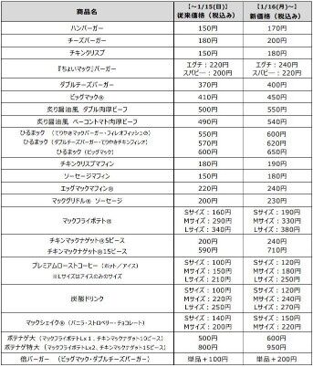 改定幅(税込み)はバーガー類単品、バリューセット®、ひるまック®、ドリンク類は10円~50円、チキンマックナゲット®15ピースは120円、ポテナゲ特大は150円などとなります。