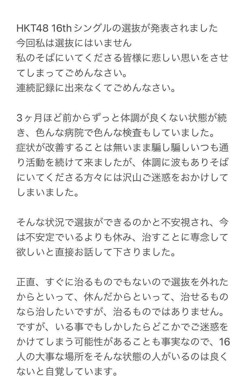 【悲報】HKT武田智加さん、原因不明の体調不良により選抜を落とされる