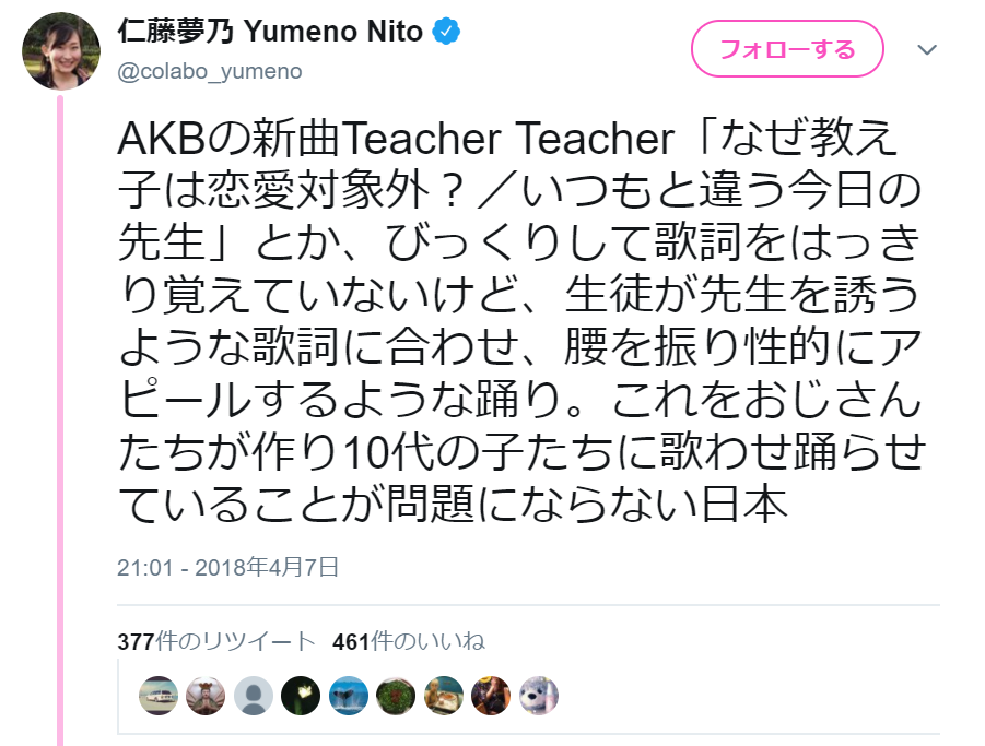AKBの新曲Teacher Teacher「なぜ教え子は恋愛対象外?/いつもと違う今日の先生」とか、びっくりして歌詞をはっきり覚えていないけど、生徒が先生を誘うような歌詞に合わせ、腰を振り性的にアピールするような踊り。