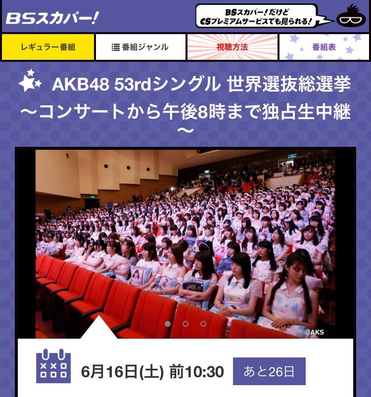 【朗報】 6/16 コンサート&世界選抜総選挙、BSスカパーで独占生中継が決定!!!