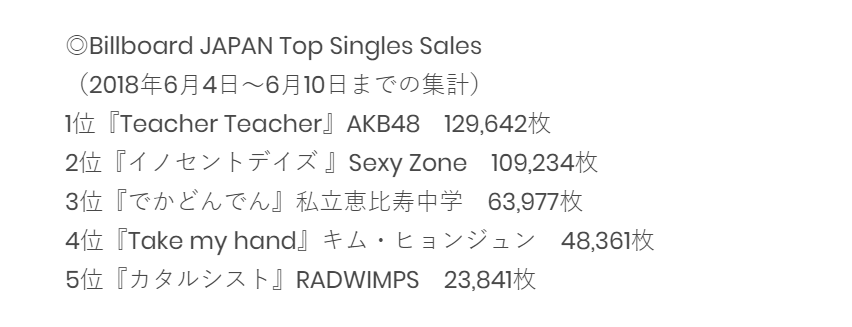 【朗報】AKB48「Teacher Teacher」2週目売上129,642枚でSexy Zone初週に勝利wwwww