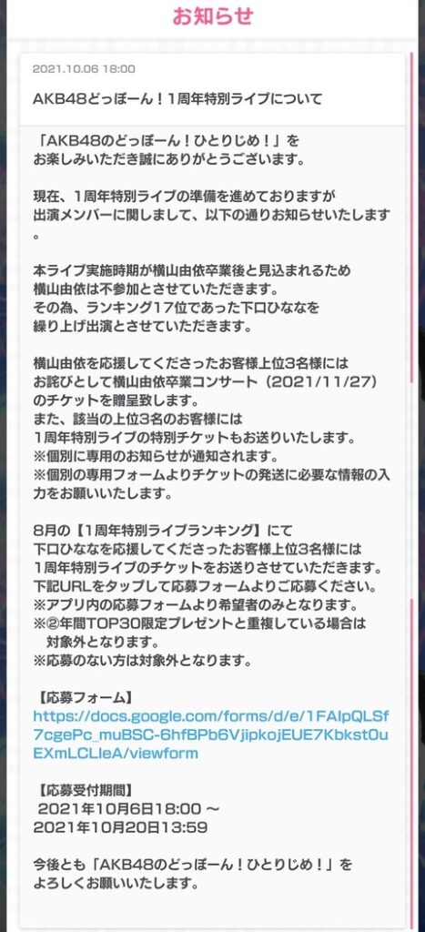 【速報】「AKB48のドボン」1周年記念ライブ、横山由依が不参加!代わりに下口ひななが繰り上げで出演決定!