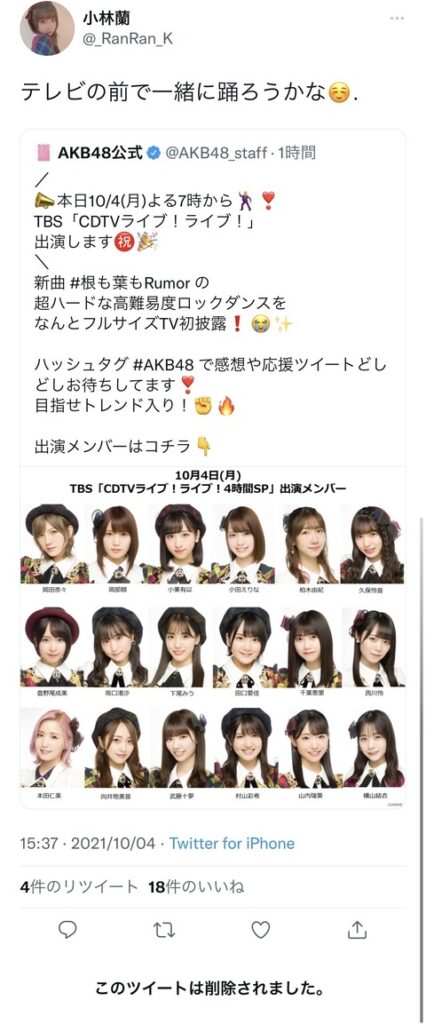 1: (ジパング) (5段) 2021/10/04(月) 05:46:35.18 AKB48公式 @AKB48_staff TBS「CDTVライブ!ライブ!」 10/4(月) 出演決定 フルサイズで新曲「根も葉もRumor」を披露します ❕ VIPQ2_EXTDAT: none:none:1000:512:: EXT was configured 18: 記事途... -